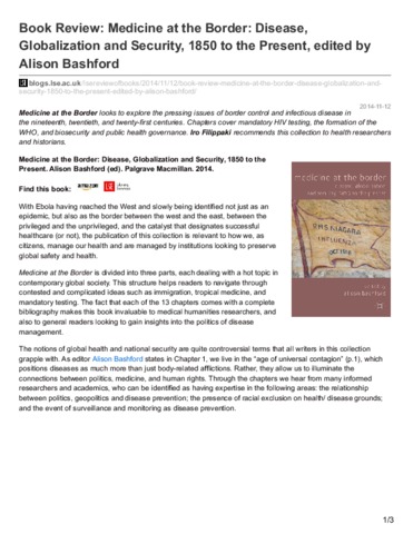 Book review: medicine at the border: disease, globalization and security, 1850 to the present, edited by Alison Bashford