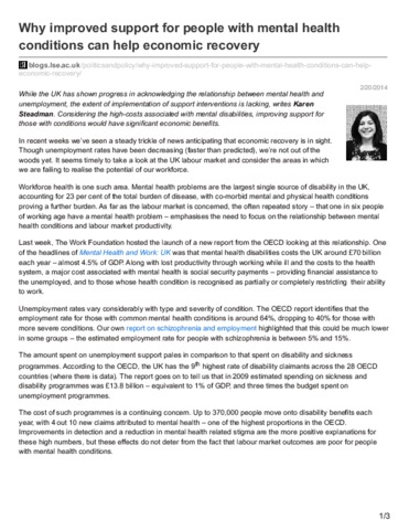 While the UK has shown progress in acknowledging the relationship between mental health and unemployment, the extent of implementation of support interventions is lacking, writes Karen Steadman. Considering the high-costs associated with mental disabilities, improving support for those with conditions would have significant economic benefits.