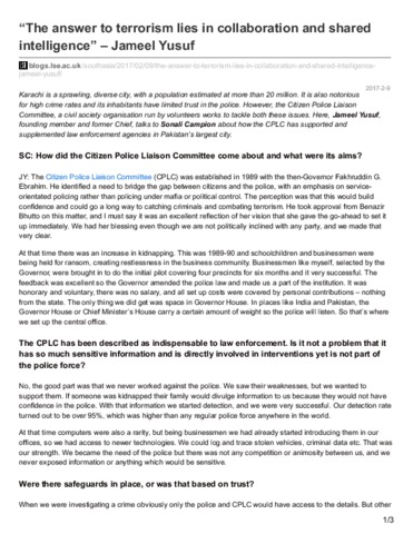 Karachi is a sprawling, diverse city, with a population estimated at more than 20 million. It is also notorious for high crime rates and its inhabitants have limited trust in the police. However, the Citizen Police Liaison Committee, a civil society organisation run by volunteers works to tackle both these issues. Here, Jameel Yusuf, founding member and former Chief, talks to Sonali Campion about how the CPLC has supported and supplemented law enforcement agencies in Pakistan’s largest city.