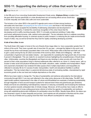 In the fifth post of our cross-blog Sustainable Development Goals series, Shabana Shiraz considers how the goal which focuses specifically on urban development can aid existing efforts across South Asia to tackle inequality and make cities safer and more sustainable.