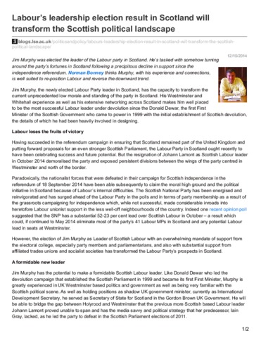 Jim Murphy was elected the leader of the Labour party in Scotland. He’s tasked with somehow turning around the party’s fortunes in Scotland following a precipitous decline in support since the independence referendum. Norman Bonney thinks Murphy, with his experience and connections, is well suited to re-position Labour and reverse the downward tren