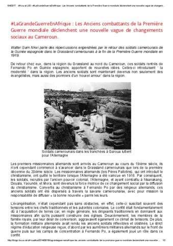 #LaGrandeGuerreEnAfrique : Les Anciens combattants de la Première Guerre mondiale déclenchent une nouvelle vague de changements sociaux au Cameroun.