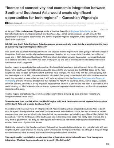 “Increased connectivity and economic integration between South and Southeast Asia would create significant opportunities for both regions” – Ganeshan Wignaraja.