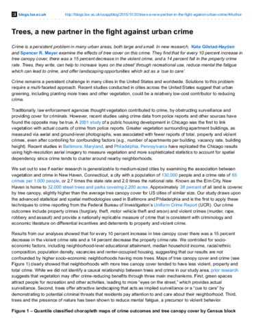 Crime is a persistent problem in many urban areas, both large and small. In new research, Kate Gilstad-Hayden and Spencer R. Meyer examine the effects of tree cover on this crime. They find that for every 10 percent increase in tree canopy cover, there was a 15 percent decrease in the violent crime, and a 14 percent fall in the property crime rate. Trees, they write, can help to increase ‘eyes on the street’ through recreational use, reduce mental the fatigue which can lead to crime, and offer landscaping opportunities which act as a ‘cue to care’.