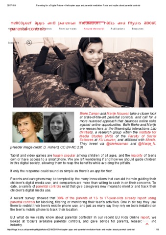 Bieke Zaman and Marije Nouwen take a closer look at state-of-the-art parental controls, and call for a more nuanced approach that balances online risks against online opportunities. Both Bieke and Marije are researchers at the Meaningful Interactions Lab (Mintlab), a research group within the Institute for Media Studies (IMS) of the Faculty of Social Sciences at KU Leuven, and affiliated with iMinds. They tweet via @biekezaman and @Marije_N.