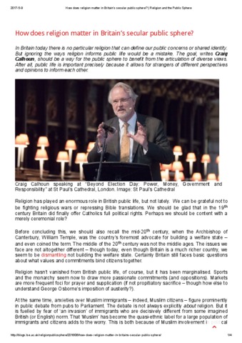 In Britain today there is no particular religion that can define our public concerns or shared identity. But ignoring the ways religion informs public life would be a mistake. The goal, writes Craig Calhoun, should be a way for the public sphere to benefit from the articulation of diverse views. After all, public life is important precisely because it allows for strangers of different perspectives and opinions to inform each other.