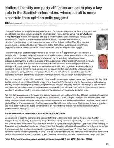 ‘DevoMax’ will not be an option on the ballot paper in the Scottish Independence Referendum next year even though it is more popular among the electorate than independence. Arno van der Zwet and Craig McAngus explore how Scottish attitudes to the two options vary according to national and party identity. They find that perceptions of national identity polarises assessments of Scotland’s performance under independence more so than it does for DevoMax. Also, people’s assessments of Scotland’s future do not always match their actual constitutional preferences, suggesting that the referendum result is more uncertain than opinion polls may suggest.
