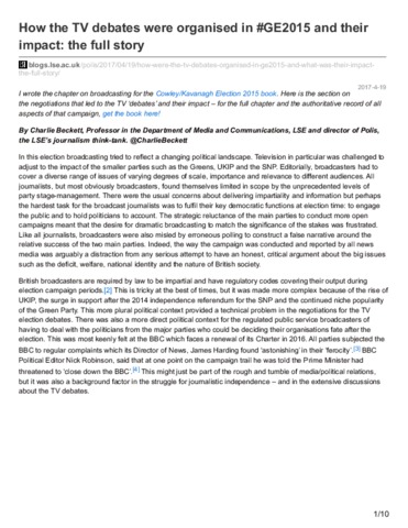 I wrote the chapter on broadcasting for the Cowley/Kavanagh Election 2015 book. Here is the section on the negotiations that led to the TV ‘debates’ and their impact – for the full chapter and the authoritative record of all aspects of that campaign, get the book here! By Charlie Beckett, Professor in the Department of Media and Communications, LSE and director of Polis, the LSE’s journalism think-tank. @CharlieBeckett
