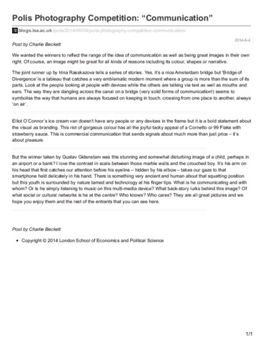 Post by Charlie Beckett We wanted the winners to reflect the range of the idea of communication as well as being great images in their own right. Of course, an image might be great for all kinds of reasons including its colour, shapes or narrative.