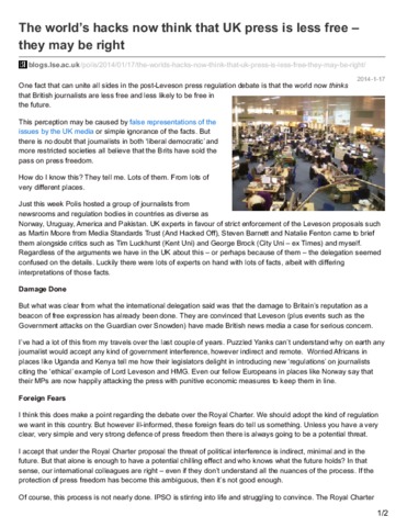 One fact that can unite all sides in the post-Leveson press regulation debate is that the world now thinks that British journalists are less free and less likely to be free in the future.