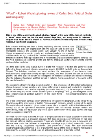 “Wow!” – Robert Wade’s glowing review of Carles Boix, Political Order and Inequality