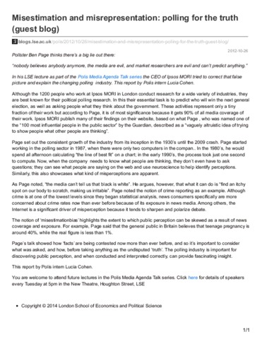 Pollster Ben Page thinks there’s a big lie out there: “nobody believes anybody anymore, the media are evil, and market researchers are evil and can’t predict anything.” In his LSE lecture as part of the Polis Media Agenda Talk series the CEO of Ipsos MORI tried to correct that false picture and explain the changing polling industry. This report by Polis intern Lucia Cohen.