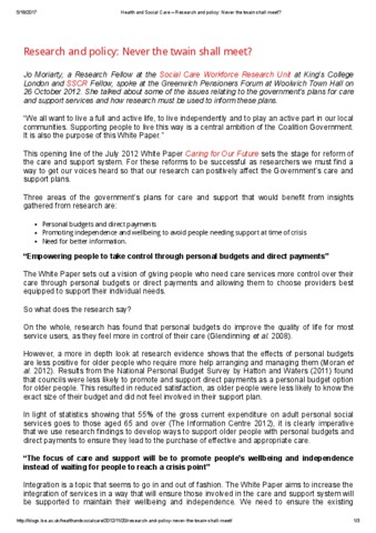 Jo Moriarty, a Research Fellow at the Social Care Workforce Research Unit at King’s College London and SSCR Fellow, spoke at the Greenwich Pensioners Forum at Woolwich Town Hall on 26 October 2012. She talked about some of the issues relating to the government’s plans for care and support services and how research must be used to inform these plans.