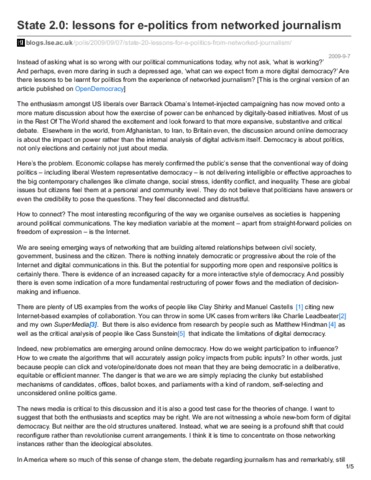 Instead of asking what is so wrong with our political communications today, why not ask, ‘what is working?’ And perhaps, even more daring in such a depressed age, ‘what can we expect from a more digital democracy?’ Are there lessons to be learnt for politics from the experience of networked journalism?