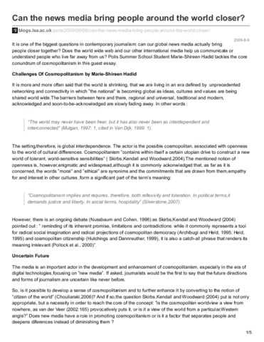 It is one of the biggest questions in contemporary journalism: can our global news media actually bring people closer together? Does the world wide web and our other international media help us communicate or understand people who live far away from us? Polis Summer School Student Marie-Shireen Hadid tackles the core conundrum of cosmopolitanism in this guest essay.