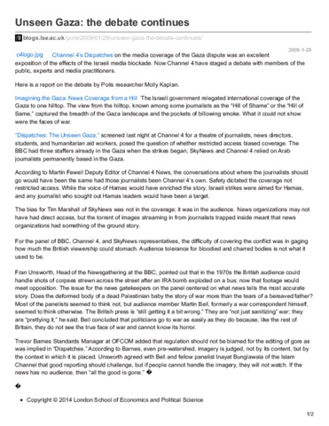 Channel 4’s Dispatches on the media coverage of the Gaza dispute was an excellent exposition of the effects of the Israeli media blockade. Now Channel 4 have staged a debate with members of the public, experts and media practitioners. Here is a report on the debate by Polis researcher Molly Kaplan.