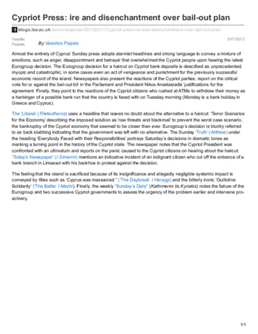 Almost the entirety of Cyprus’ Sunday press adopts alarmist headlines and strong language to convey a mixture of emotions, such as anger, disappointment and betrayal that overwhelmed the Cypriot people upon hearing the latest Eurogroup decision. The Eurogroup decision for a haircut on Cypriot bank deposits is described as unprecedented, myopic and catastrophic; in some cases even an act of vengeance and punishment for the previously successful economic record of the island. Newspapers also present the reactions of the Cypriot parties; report on the critical vote for or against the bail-out bill in the Parliament and President Nikos Anastasiadis’ justifications for the agreement. Finally, they point to the reactions of the Cypriot citizens who rushed at ATMs to withdraw their money as a harbinger of a possible bank run that the country is faced with on Tuesday morning (Monday is a bank holiday in Greece and Cyprus).