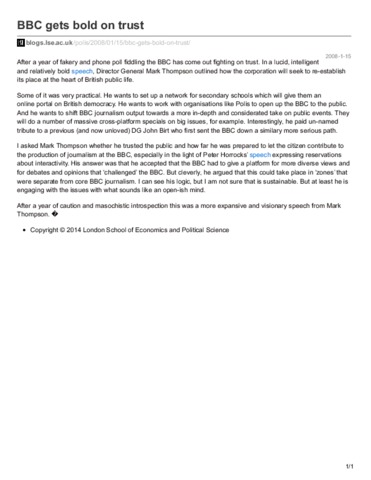 After a year of fakery and phone poll fiddling the BBC has come out fighting on trust. In a lucid, intelligent and relatively bold speech, Director General Mark Thompson outlined how the corporation will seek to re-establish its place at the heart of British public life.