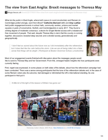 What do the public in East Anglia, where both Leave (in rural Lincolnshire) and Remain (in Cambridge) polled strongly, want from Brexit? Catherine Barnard (left) and Amy Ludlow held public engagement events in school halls, community centres, prisons and market squares in parts of Lincolnshire, Norfolk, and Cambridgeshire in early 2017. They found a striking degree of moderate consensus: a desire for Single Market access with a rebalanced free movement of people. That said, despite Theresa May’s claim that the country is coming together, discussions revealed deep wounds and a divided society, generationally and geographically.