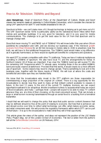 Jane Humphreys, Head of Spectrum Policy at the Department of Culture, Media and Sport shares her remarks made at yesterday’s Oxford Media Convention, which consider the choices for using UHF spectrum for both TV and mobile broadband in the UK.
