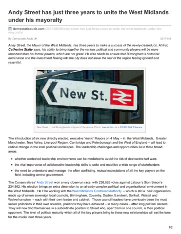 Andy Street, the Mayor of the West Midlands, has three years to make a success of the newly-created job. At first, Catherine Staite says, his ability to bring together the various political and community players will be more important than his formal powers, which are not great. He also needs to ensure that Birmingham’s historical dominance and the investment flowing into the city does not leave the rest of the region feeling ignored and resentful.