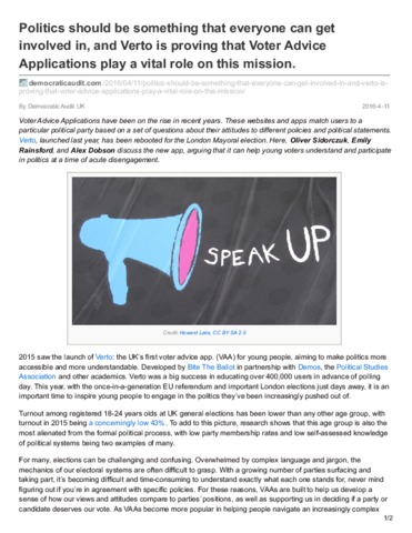 Voter Advice Applications have been on the rise in recent years. These websites and apps match users to a particular political party based on a set of questions about their attitudes to different policies and political statements. Verto, launched last year, has been rebooted for the London Mayoral election. Here, Oliver Sidorczuk, Emily Rainsford, and Alex Dobson discuss the new app, arguing that it can help young voters understand and participate in politics at a time of acute disengagement.