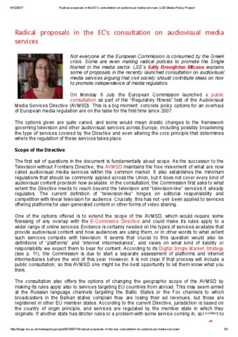 Not everyone at the European Commission is consumed by the Greek crisis. Some are even making radical policies to promote the Single Market in the media sector. LSE’s Sally Broughton Micova explains some of proposals in the recently launched consultation on audiovisual media services arguing that civil society should contribute ideas on how to promote independence of media regulators.