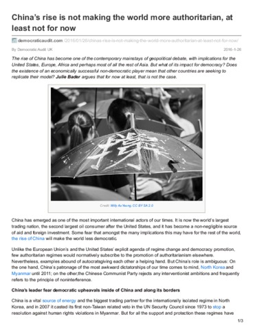 The rise of China has become one of the contemporary mainstays of geopolitical debate, with implications for the United States, Europe, Africa and perhaps most of all the rest of Asia. But what of its impact for democracy? Does the existence of an economically successful non-democratic player mean that other countries are seeking to replicate their model? Julie Bader argues that for now at least, that is not the case.
