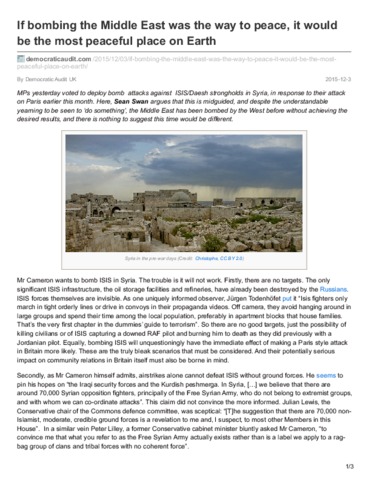 MPs yesterday voted to deploy bomb attacks against ISIS/Daesh strongholds in Syria, in response to their attack on Paris earlier this month. Here, Sean Swan argues that this is midguided, and despite the understandable yearning to be seen to ‘do something’, the Middle East has been bombed by the West before without achieving the desired results, and there is nothing to suggest this time would be different.