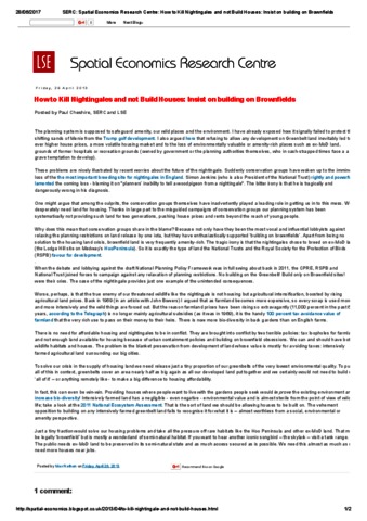 Posted by Paul Cheshire, SERC and LSE The planning system is supposed to safeguard amenity, our wild places and the environment. I have already exposed how it signally failed to protect the shifting sands of Menie from the Trump golf development. I also argued here that refusing to allow any development on Greenbelt land inevitably led to ever higher house prices, a more volatile housing market and to the loss of environmentally valuable or amenity-rich places such as ex-MoD land, grounds of former hospitals or recreation grounds (owned by government or the planning authorities themselves, who in cash-strapped times face a a grave temptation to develop).