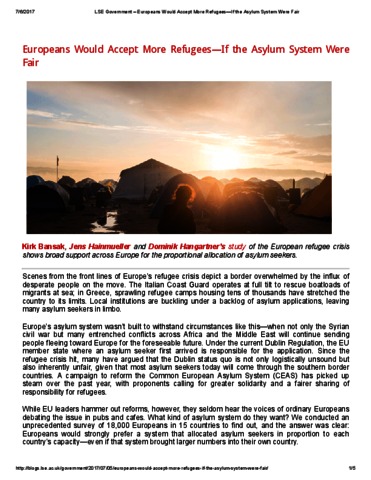 Kirk Bansak, Jens Hainmueller and Dominik Hangartner’s study of the European refugee crisis shows broad support across Europe for the proportional allocation of asylum seekers.