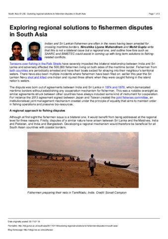 Indian and Sri Lankan fishermen are often in the news having been arrested for crossing maritime borders. Niroshika Liyana Muhandiram and Mohit Gupta write that this is not a bilateral issue but a regional one, and outline how fora such as SAARC and BIMSTEC could assist in coming up with long term solutions to fishing-related conflicts.