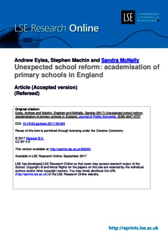 The change of government in 2010 provoked a large structural change in the English education landscape. Unexpectedly, the new government offered primary schools the chance to have ‘the freedom and the power to take control of their own destiny’, with better performing schools given a green light to fast track convert to become an academy school. In England, schools that become academies have more freedom over many ways in which they operate, including curriculum design, budgets, staffing issues and the shape of the academic year. However, the change to allow primary school academisation has been controversial. This paper reports estimates of the causal effect of academy enrolment on primary school pupils. While the international literature provides growing evidence on the effect of school autonomy in a variety of contexts, little is known about the effect of autonomy on primary schools (which are typically much smaller than secondary schools) and in contexts where the converting school is not deemed to be failing or disadvantaged. The key findings are that English primary schools did change their mode of operation after the exogenous policy change, utilising more autonomy and changing spending behaviour, but this did not lead to improved pupil performance.