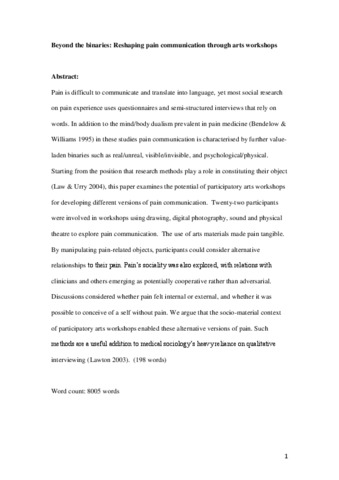 Pain is difficult to communicate and translate into language, yet most social research on pain experience uses questionnaires and semi-structured interviews that rely on words. In addition to the mind/body dualism prevalent in pain medicine (Bendelow & Williams 1995) in these studies pain communication is characterised by further value-laden binaries such as real/unreal, visible/invisible, and psychological/physical. Starting from the position that research methods play a role in constituting their object (Law & Urry 2004), this paper examines the potential of participatory arts workshops for developing different versions of pain communication. Twenty-two participants were involved in workshops using drawing, digital photography, sound and physical theatre to explore pain communication. The use of arts materials made pain tangible. By manipulating pain-related objects, participants could consider alternative relationships to their pain. Pain’s sociality was also explored, with relations with clinicians and others emerging as potentially cooperative rather than adversarial. Discussions considered whether pain felt internal or external, and whether it was possible to conceive of a self without pain. We argue that the socio-material context of participatory arts workshops enabled these alternative versions of pain. Such methods are a useful addition to medical sociology’s heavy reliance on qualitative interviewing (Lawton 2003).
