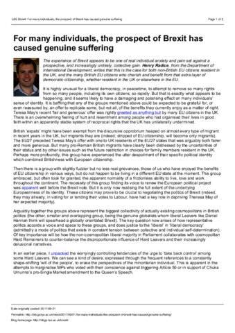 The experience of Brexit appears to be one of real individual anxiety and pain set against a prospective, and increasingly unlikely, collective gain. Henry Radice, from the Department of International Development, writes that this is the case for both non-British EU citizens resident in the UK, and the many British EU citizens who cherish and benefit from that extra layer of democratic citizenship, ...