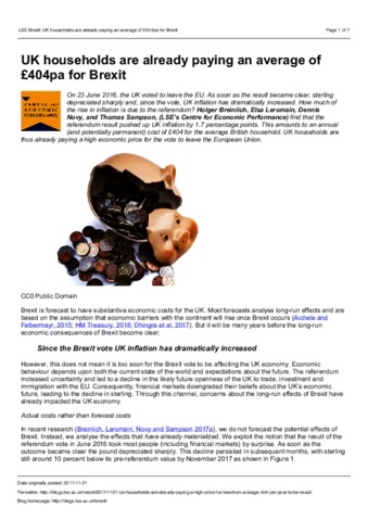 On 23 June 2016, the UK voted to leave the EU. As soon as the result became clear, sterling depreciated sharply and, since the vote, UK inflation has dramatically increased. How much of the rise in inflation is due to the referendum? Holger Breinlich, Elsa Leromain, Dennis Novy, and Thomas Sampson, (LSE's Centre for Economic Performance) find that the referendum result pushed up UK inflation ...