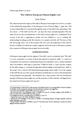 This article examines the category of ‘the child’ in European human rights law, based on an analysis of the child‐related jurisprudence of the European Court of Human Rights. It argues that a full account of legal selfhood is constructed through the notion of ‘the child’ in this jurisprudence. The two notions – of ‘the child’ and ‘the self’ – are, from the outset, mutually dependent. The conceptualisation of ‘the child’ in human rights law is underpinned by an account of the self as originating in another and childhood is cast as enabling self‐understanding by making possible the formation of a narrative about the self. The vision of ‘the self’ that emerges is one of ‘the narrative self’, and I assess the implications of this both for the idea of childhood in which this narrative originates and for the vision of the human condition that is expressed in European human rights law more broadly.
