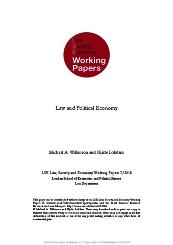 ‘Law and Political Economy’ surveys recent approaches to the study of phenomena at the intersection of law, politics and the economy. These take an interdisciplinary perspective, viewing markets as fields of social power that are not spontaneous but created and reproduced in the meeting of legal norms, political action and economic activity. Through regulating economic relationships, the politico-legal order constitutes and reconstitutes the power relations that make up society. This, in turn, is driven by the formation of class, sectoral and geopolitical interests, as well as ideological convictions, which harness political and legal authority. We present these inter-related processes through exploring contemporary debates on inequality, inter-personal market relations, the relation between the state and market, and the effects of economic integration and globalisation on democracy and political self- determination.