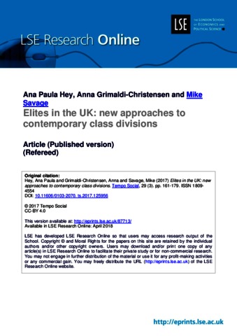 Elites in the uk: new approaches to contemporary class divisions The aim of this article is to demonstrate the “new” elites emerging in the uk amidst the economic, political and social context of neoliberalism. To do this, we examine the works of Mike Savage regarding what elite studies have meant for contemporary forms of social division. Using data from the Great British Class Survey, the author underlines sociological elements that are central to the composition of this financialised elite. We describe cleavages in terms of social mobility, education, location and politicization that are generated through the concentration of distinct types of capital (economic, social and cultural). Departing from the specific context of Great Britain, we intend to contribute to the development of a sociology of elites, through a discussion of both new perspectives and the limits and possibilities of treating different geographic, political and social contexts.