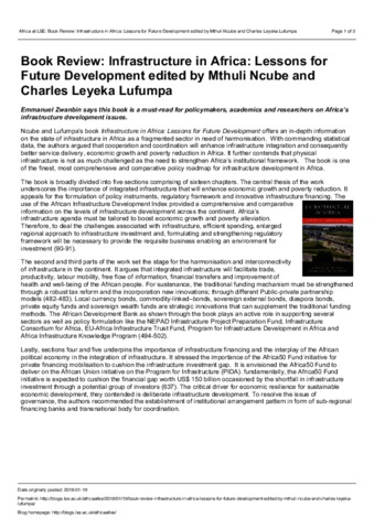 Book review: infrastructure in Africa: lessons for future development edited by Mthuli Ncube and Charles Leyeka Lufumpa