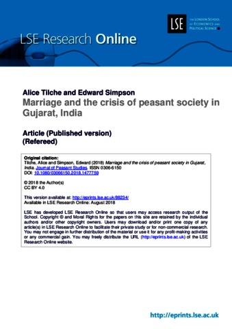 This article takes marriage as the example of a crisis of production and reproduction in rural India: of a great transformation of values away from agriculture towards a culture of migration, and of a more uncertain transformation of the agrarian economy. Through the juxtaposition of ethnography separated by six decades, we detail a shift away from land and agriculture as the primary markers of status among the Patidars of central Gujarat, western India. In the 1950s, land and agricultural know-how were central to the ways in which the Patidars thought about each other’s worth and status. In 2013, the relationship between land and social status had dramatically weakened to be replaced by a hierarchical understanding of international migration. Patidars owned land and, unlike in other parts of rural India, agriculture continued to be economically remunerative. However, farmers were considered culturally and morally impoverished. We discuss the disconnect between a cultural revolution in favour of migration, and the failure of many to live up to their own cultural standards. It shows how migration, and the failure to migrate have had dramatic consequences for social reproduction, exacerbating and, to an extent creating, the new problem of bachelorhood among young farmers. As a consequence, practices of downward mobility had become crucial to the reproduction of the group, while also posing a threat to its very identity. The article more broadly reflects on the simultaneous forces that strengthen and dissolve caste inequality in the context of India’s uneven growth.