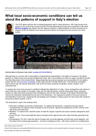 The 2018 Italian election had a notable geographic split in voting behaviour, with Lega having more support in the north of the country and the Five Star Movement proving more successful in the south. Monica Langella digs deeper into the regional variations underpinning the result by carrying out an analysis of the link between local socio-economic factors and support for the country's four main parties.
