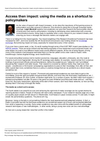As the value of research with impact increases, so too does the importance of first gaining access to policymakers and other persons of influence. One shortcut to doing this is through increased media coverage. Leigh Marshall explains how academics can give their research the best possible chance of being seen and read by policymakers; including by developing close relationships with university communications teams, being ready to capitalise when a story relevant to your research breaks, and ensuring you have a message that decision-makers can engage with.